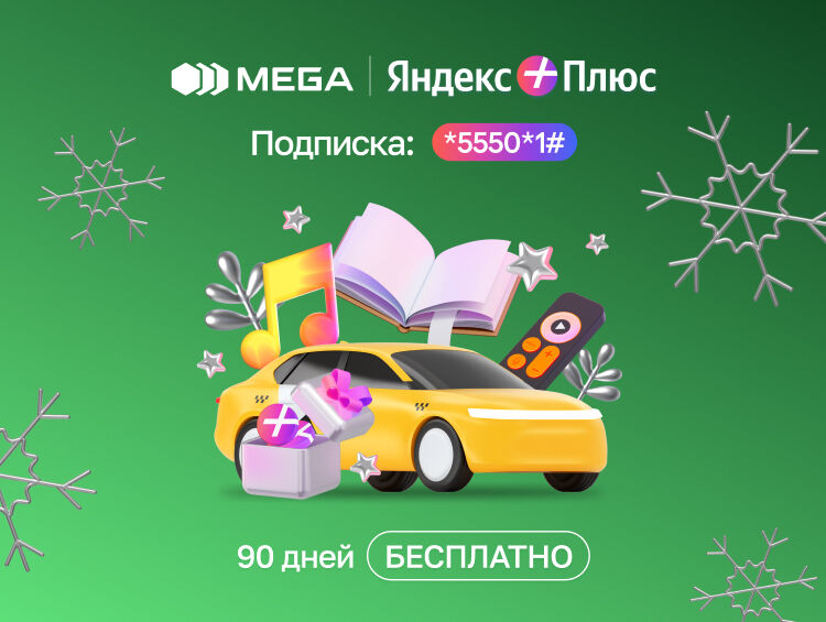 Акция только для абонентов MEGA — подписка «Яндекс Плюс» предоставляется БЕСПЛАТНО на целых 90 дней. Теперь пользователи могут БЕСПЛАТНО наслаждаться музыкой, фильмами, книгами, подкастами и получать скидки на поездки с одним удобным тарифом.