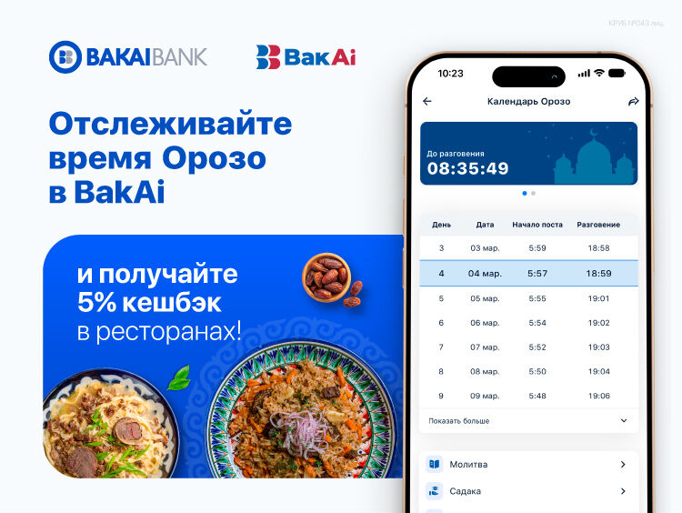 «Бакай Банк» подготовил особенный подарок для своих клиентов в священный месяц Рамазан! Теперь в мобильном приложении BakAi доступен удобный календарь Орозо-2025, а также весь месяц Рамазан действует повышенный кешбэк — 5 процентов на покупки в ресторанах и кафе.