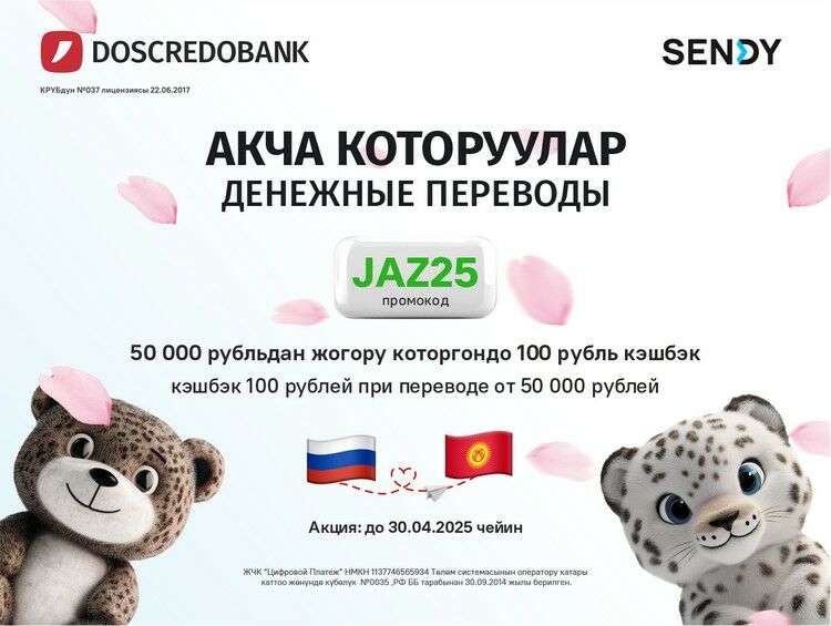 - средства зачисляются в сомах, выдаются наличными в кассах Doscredobank;