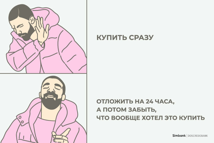 Перед покупкой сделайте паузу на сутки. Да, даже если на сайте написано «Срочно! Только три штуки по суперцене!» Часто за это время импульсивное желание пропадает, и вы осознаете, что вещь вовсе не так уж и нужна.