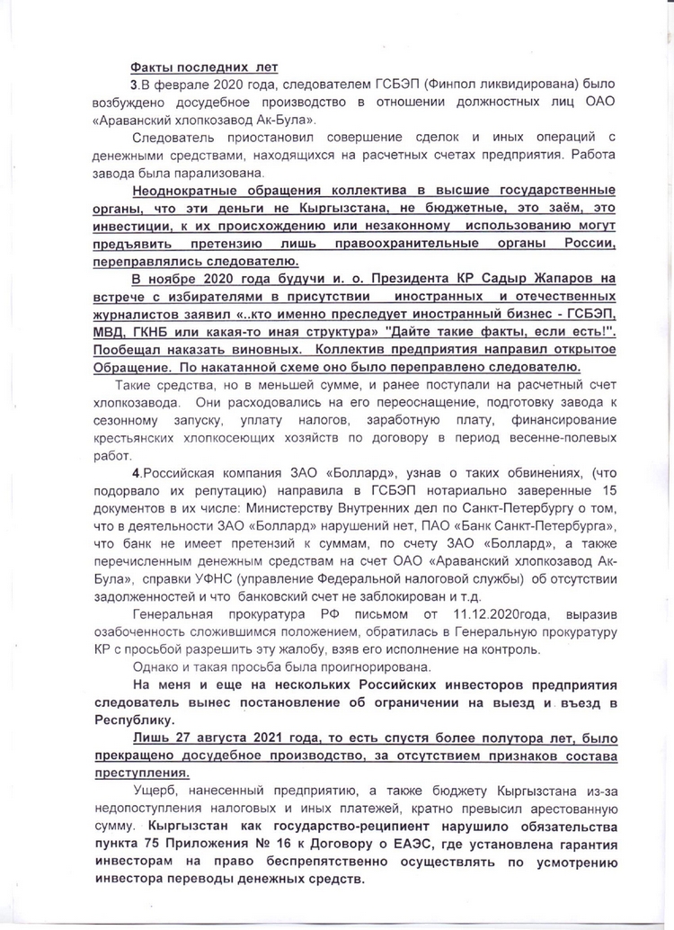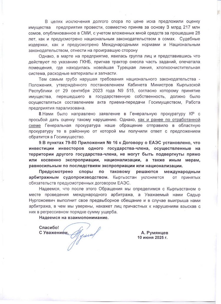 Согласно принципам международных договоров (в частности ЕАЭС) и национального законодательства КР, я являюсь российским инвестором. Завод, построенный в 1953 году, в тот период не работал, находился на грани банкротства, существуя только за счет продажи оставшихся от развала Союза материальных ценностей. Я завез новые станки, оборудование, запустил производство. Тогда же я награжден почетной грамотой и благодарственным письмом за налаживание дружественных связей между Санкт-Петербургом и Кыргызстаном и активную инвестиционную деятельность», — отметил автор обращения.