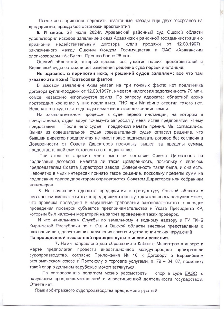 «Я вынужден повториться, но наше предприятие испытывает постоянный прессинг со стороны правоохранительных и иных госорганов, цель которых — воспрепятствование деятельности Араванского хлопкозавода «Ак-Була» или даже отъем активов. Считаю, что таким образом не исполняются гарантии страны — участницы ЕАЭС в обеспечении защиты прав инвесторов», — сказал Александр Румянцев.