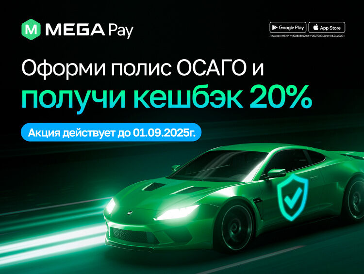 С 1 июля 2025 года начнут действовать штрафы за отсутствие полиса ОСАГО. Если вы еще не оформили страховку, сейчас идеальное время! В приложении MegaPay вы можете быстро и удобно оформить ОСАГО онлайн и получить повышенный кешбэк — 20 процентов!