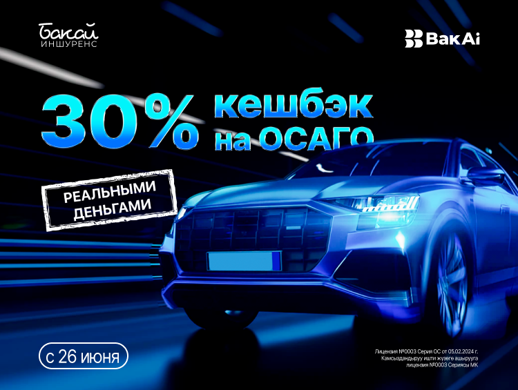 С 26 июня по 30 сентября 2025 года каждый клиент Bakai Bank может оформить обязательный полис ОСАГО в приложении BakAi и получить кешбэк 30 процентов реальными деньгами!