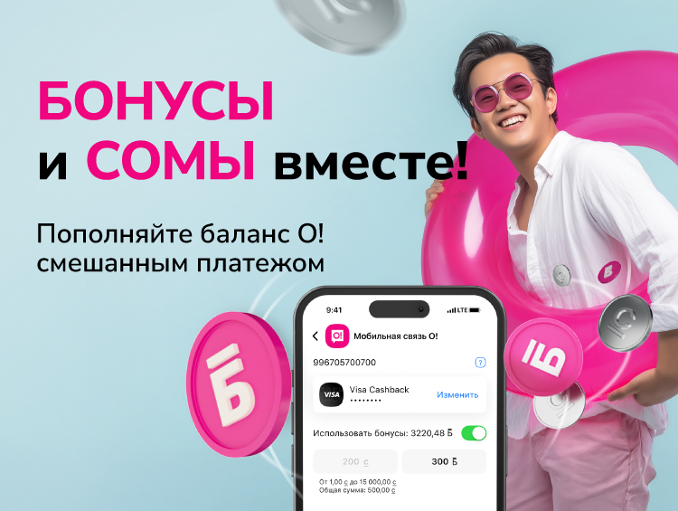 Так вот, у абонентов О! есть классная фишка — в приложении «Мой О!» можно пополнить баланс сразу и сомами, и бонусами. Часть платите с карты, а часть — бонусами.
