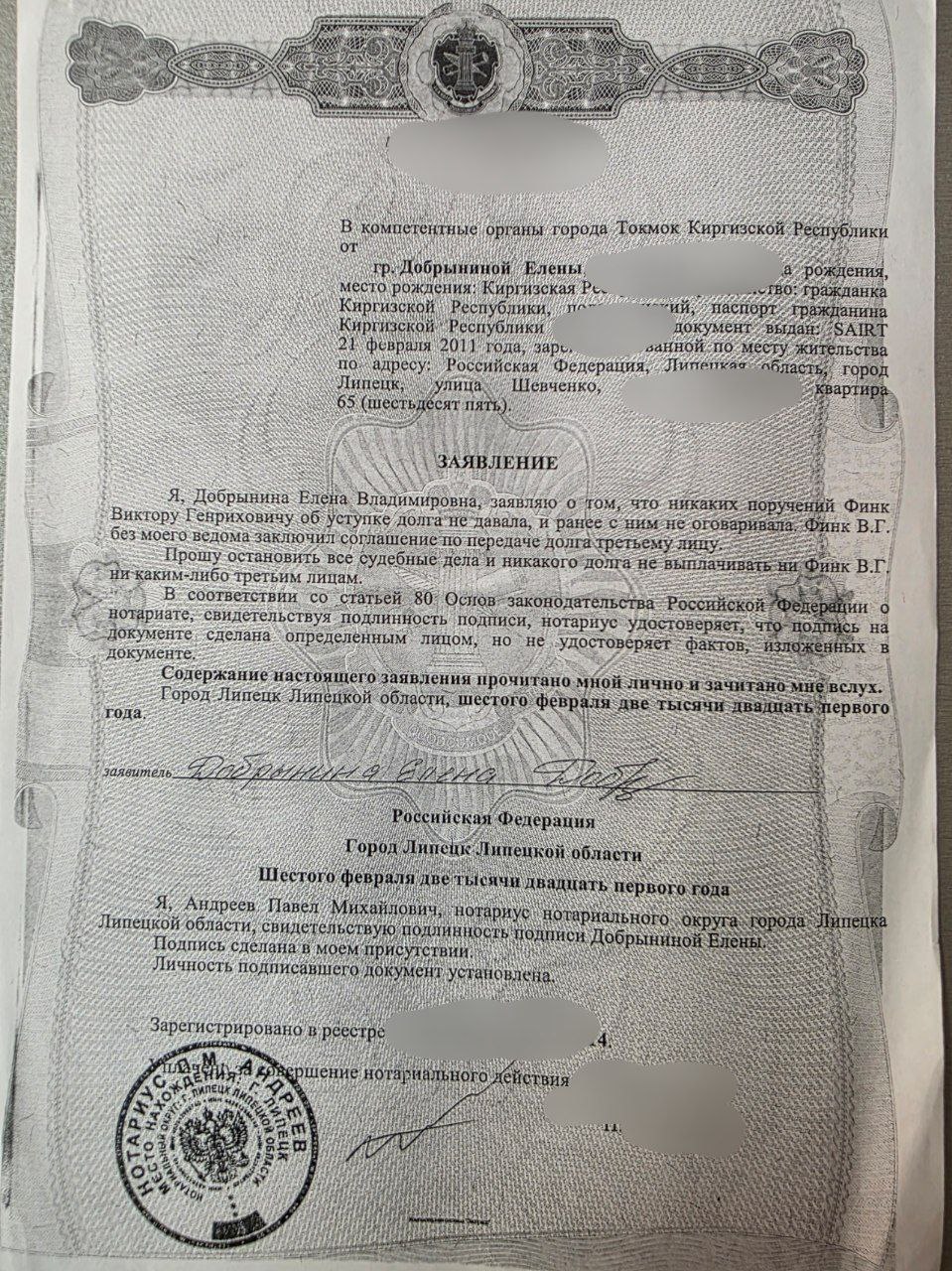 «Виктор Финк, не являясь собственником здания, расположенного в городе Токмак по адресу: улица Овчарова, 39а, требует у нынешнего собственника Мухаммада Имран Назира за якобы принадлежащий ему первый этаж порядка 1 миллиона евро. При этом в случае отказа угрожает уголовным преследованием, вплоть до заключения под стражу, и хвастается своими связями в Генеральной прокуратуре», — говорится в документе, направленном к президенту.