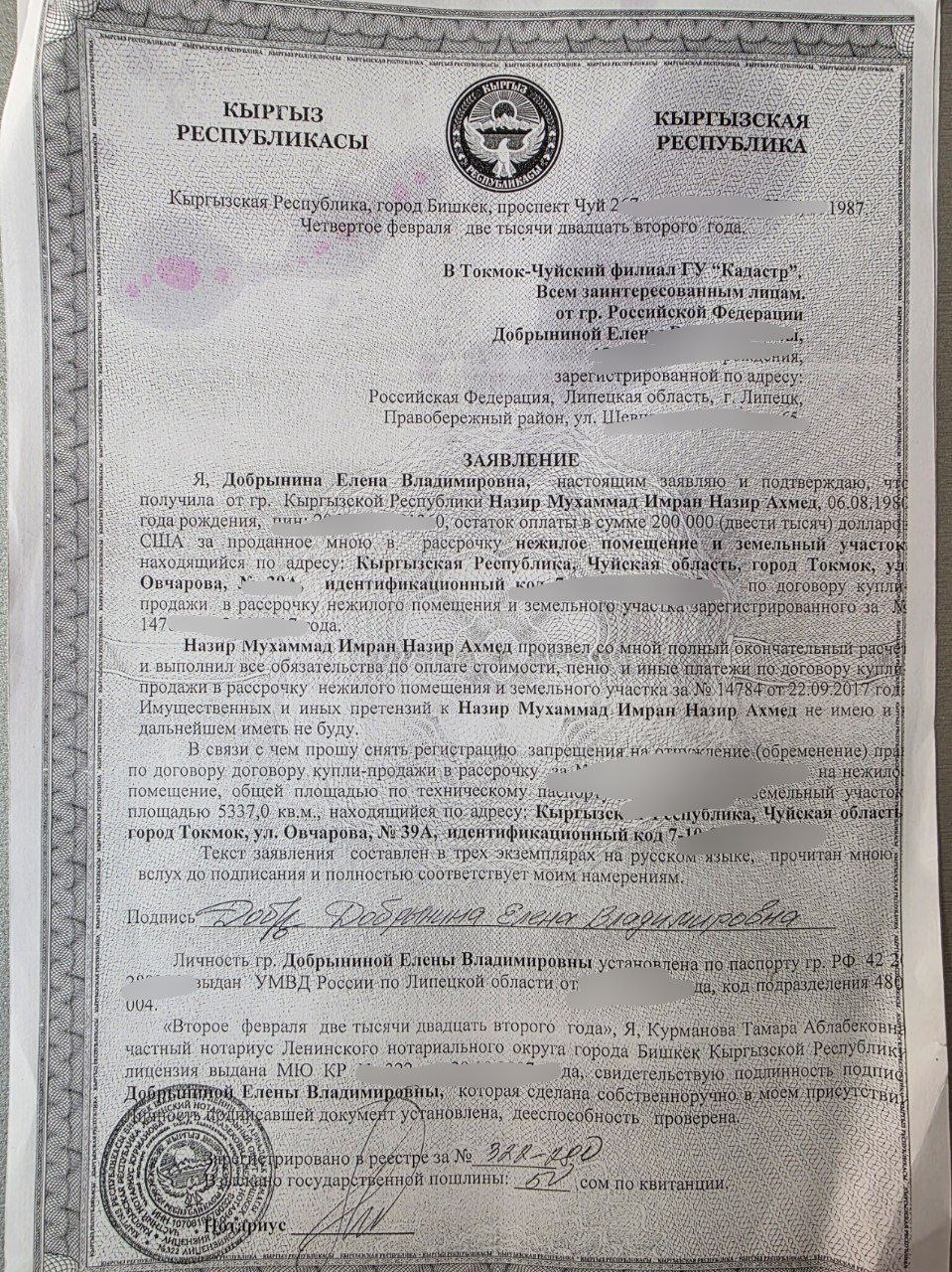 Сажжад Ахмед рассказал, что в 2017 году купили в городе Токмак здание вместе с участком у Виктора Финка — гражданина Германии, проживающего в Кыргызстане. Он оценил свое имущество в $300 тысяч, получил $100 тысяч с условием, что остаток будет выплачен в рассрочку. Продавец должен был освободить здание в течение 40 дней. Но позже он заявил покупателям, что уезжает на лечение в Германию, а освободит здание по возвращению в Кыргызстан.