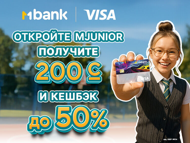 MBANK совместно с международной платежной системой Visa объявляет о старте акции для держателей детских карт MJunior! Откройте карту MJunior для безопасных и удобных покупок и получите бонусы: 200 сомов на счет и до 50 процентов кешбэка на покупки!