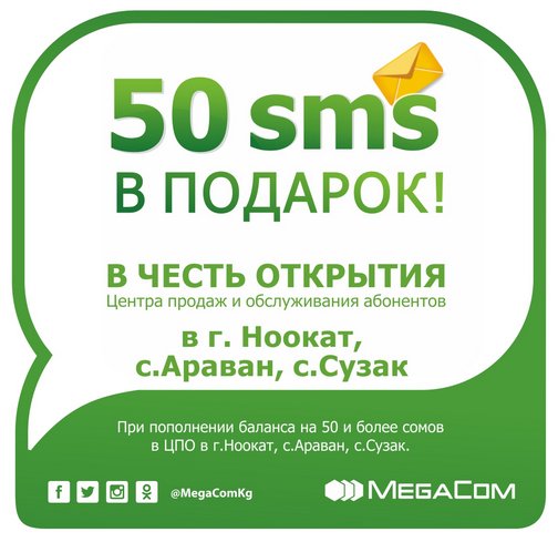 Кроме того, 50 SMS бесплатного общения в сети Megacom на 10 дней в подарок получат абоненты, пополнившие баланс на 50 и более сомов в новых центрах продаж и обслуживания MegaCom: