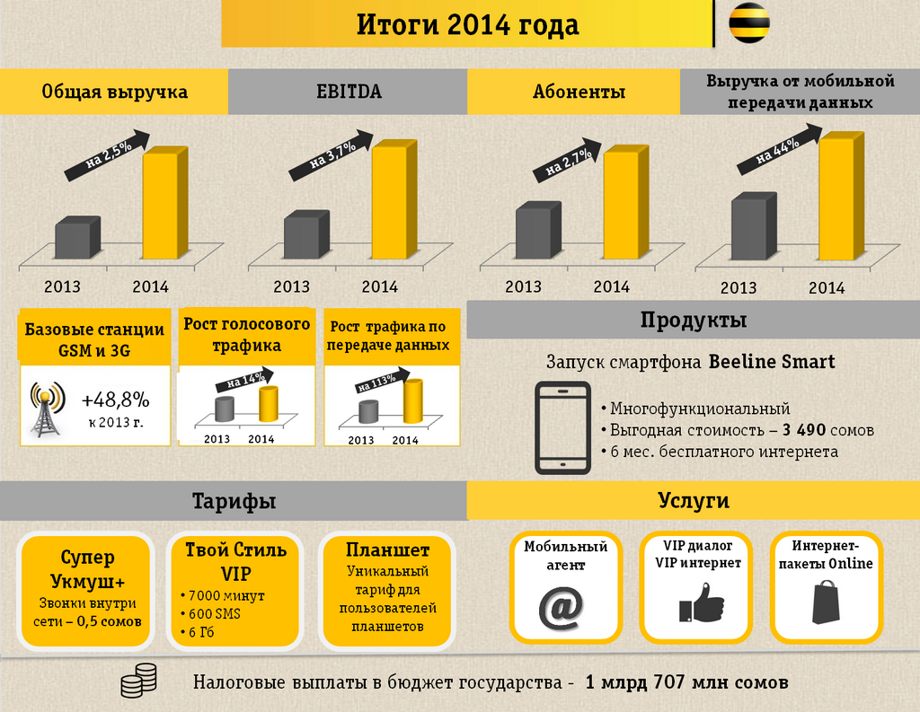 Лидер телекоммуникационного рынка Кыргызстана Beeline объявляет общие итоги работы группы компаний «ВымпелКом Лтд.» и Beeline в КР за 2014 год.