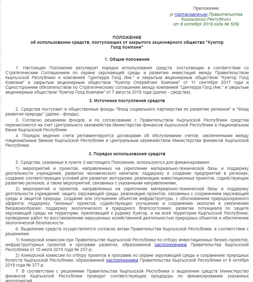 Зато в распоряжении агентства оказалось положение об использовании средств, поступающих от Закрытого акционерного общества «Кумтор Голд Компании». Согласно ему, средства в оба фонда перечисляют на счет Центрального казначейства Министерства финансов в Национальном банке.