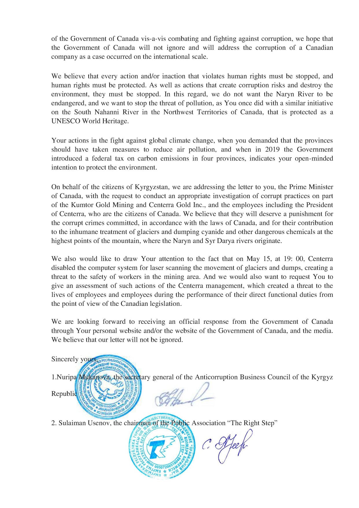 В нем также обращается внимание на то, что Centerra Gold Inc. отключила автоматическую систему лазерного сканирования движения ледников на руднике «Кумтор». Гражданские активисты уверены, что это создало угрозу безопасности работников. Они попросили Джастина Трюдо дать оценку и этим действиям с точки зрения канадского законодательства.
