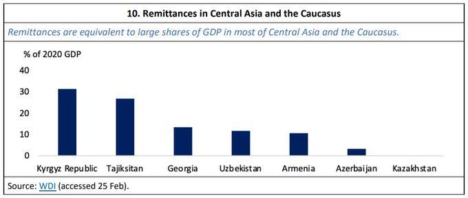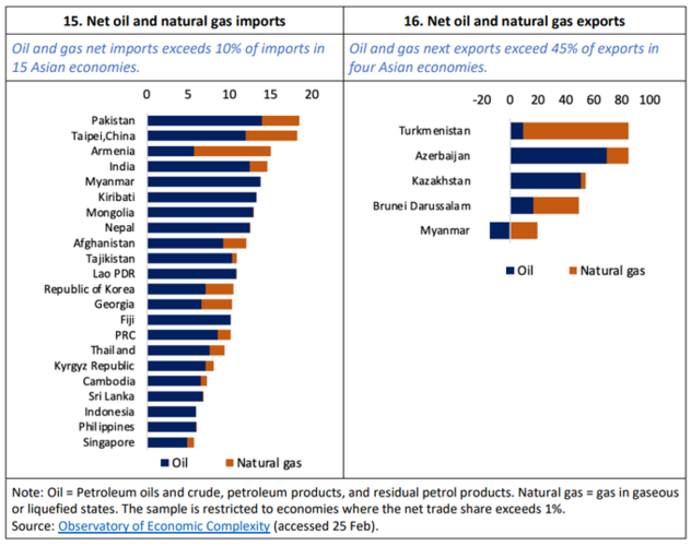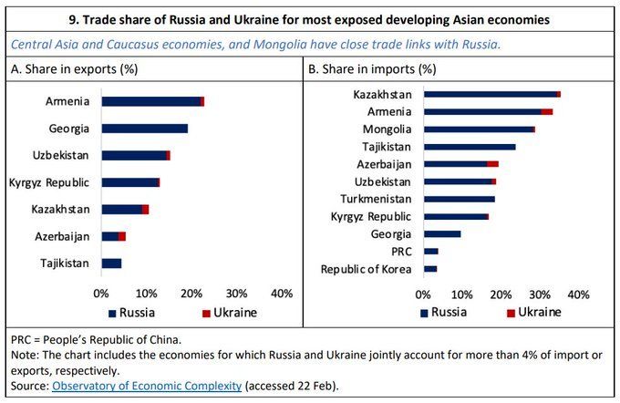 Еще один критический момент в российско-украинском конфликте — платежные балансы некоторых государств Центральной Азии и Кавказа сильно зависят от денежных переводов из РФ, которые резко сократятся из-за потери работы мигрантами, обесценивания рубля и отсутствия доступа российских банков к SWIFT. Наибольшее влияние на экономику стран Азии окажет повышение цен на нефть и газ, которое подстегнет инфляцию и замедлит рост в государствах-импортерах энергоресурсов, но поможет нетто-экспортерам. Как отметил Альберт Парк, военные действия РФ и Украины повысят цены на продукты. Россия и Украина обеспечивают 22 и 18 процентов мирового экспорта пшеницы и ячменя. Украина обеспечивает 15 и 12 процентов мирового экспорта рапса и кукурузы, а РФ обеспечивает 12 процентов мирового экспорта удобрений.