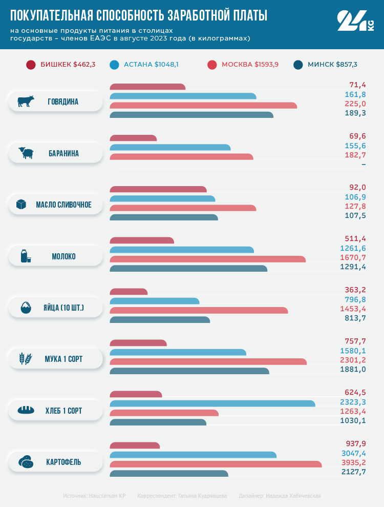 Например, в столице Кыргызстана на среднюю заработную плату можно купить более 700 килограммов муки, тогда как в Москве — в три раза больше (2 тысячи 301,2 килограмма). В Астане на одну зарплату можно приобрести 3 тонны картофеля, а в Бишкеке — чуть более 900 килограммов.