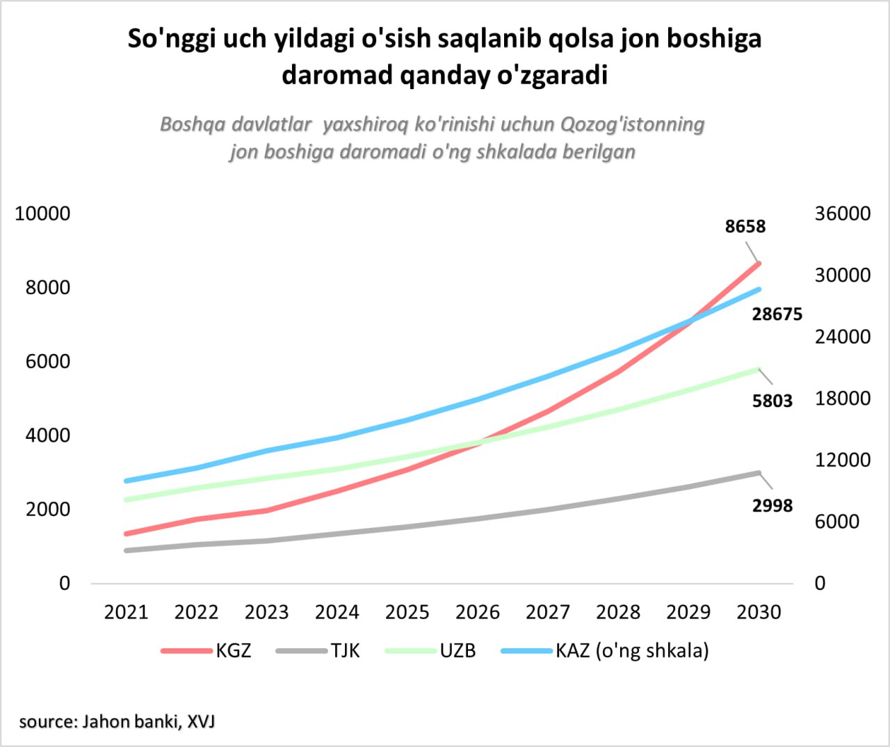 Эксперт также считает, что если динамика сохранится, к 2026 году Кыргызстан догонит Узбекистан по доходу на душу населения, а с 2027-го средний кыргызстанец может обогнать по доходам среднестатистического жителя Узбекистана. К 2030 году разрыв может составить до 50 процентов в пользу Кыргызстана.