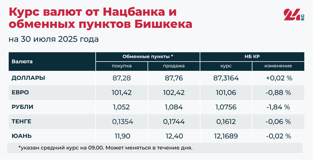 - Официальный курс НБ КР: 87,3164 сома (рост на 0,02 процента). Первое повышение за 6 дней.