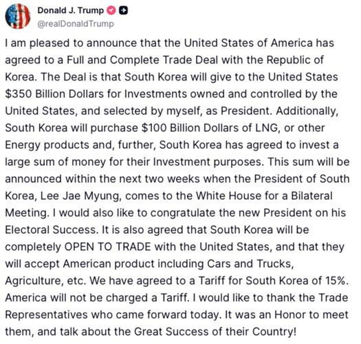 К товарам из Южной Кореи в Соединенных Штатах будет применяться тариф в размере 15 процентов, тогда как американские поставщики получат беспошлинный доступ.