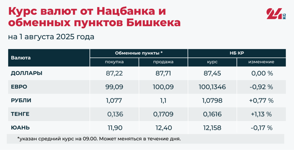 • Средний курс в обменных пунктах: покупка — 87,22 сома, продажа — 87,71 сома.