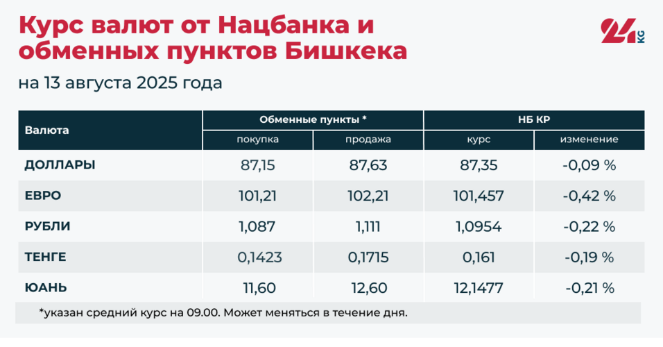• Средний курс в обменных пунктах: покупка — 87,15 сома, продажа — 87,63 сома.