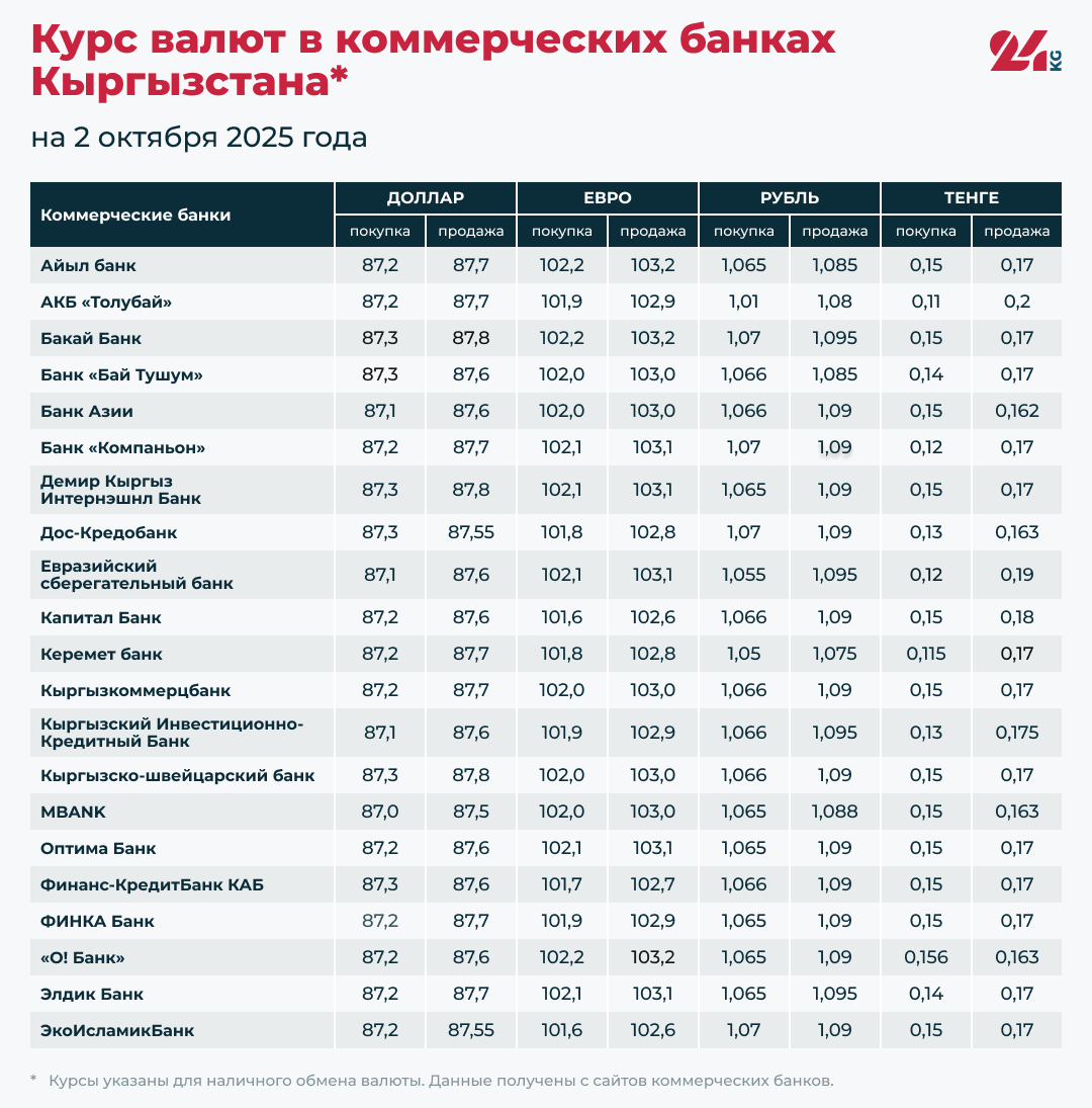 Информация актуальна на момент публикации. Курсы указаны для наличного обмена валюты. В течение дня курсы валюты могут меняться.Официальный курс Нацбанка КР и курсы валют в обменных пунктах Бишкека можно посмотреть здесь.
