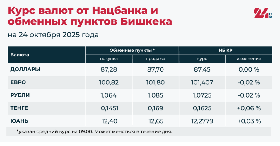 • Средний курс в обменных пунктах: покупка — 100,82 сома, продажа — 101,8 сома.