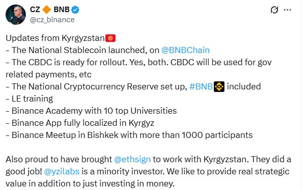 По его словам, стейблкоин выпущен на блокчейне BNB Chain, а CBDC Кыргызстана будет использоваться для государственных и официальных расчетов.