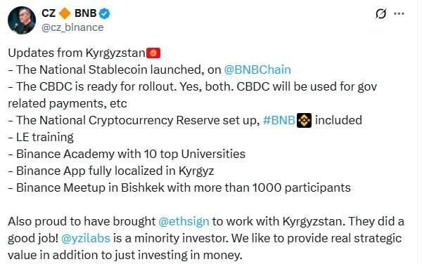 Чанпэн Чжао сообщил о партнерстве с платформой EthSign, которая поможет Кыргызстану в развитии цифровых решений на блокчейне.