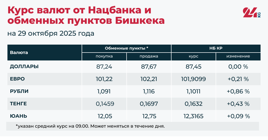 - Официальный курс НБ КР: 87,45 сома (без изменений).