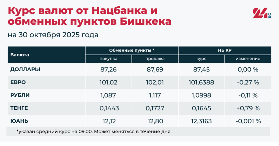 • Средний курс в обменных пунктах: покупка — 87,26 сома, продажа — 87,69 сома.