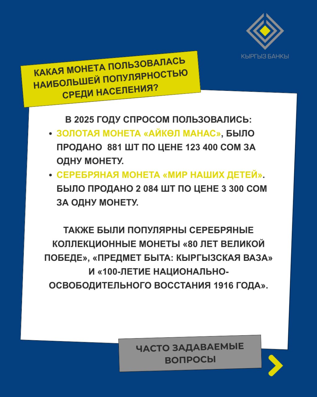 Также спросом пользовались серебряные монеты «80 лет Великой Победе», «Предмет быта: кыргызская ваза» и «100-летие национально-освободительного восстания 1916 года».