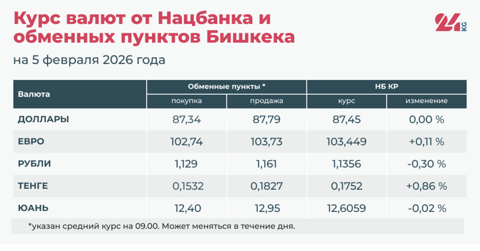 • Официальный курс НБ КР: 12,6059 сома (снижение на 0,02 процента).