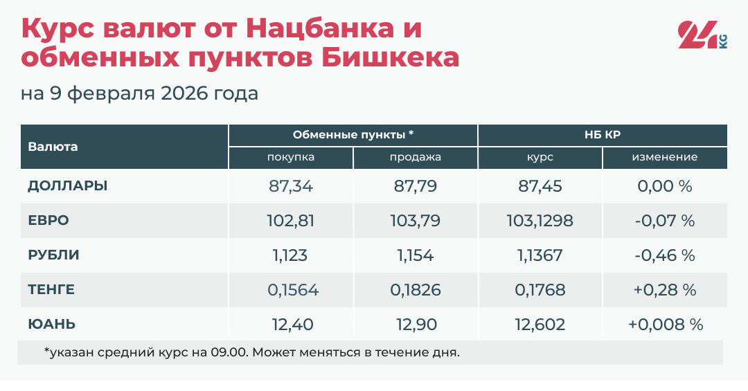 • Средний курс в обменных пунктах: покупка — 87,34 сома, продажа — 87,79 сома.