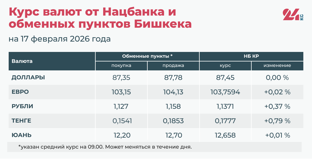 - Официальный курс НБ КР: 87,45 сома (без изменений).