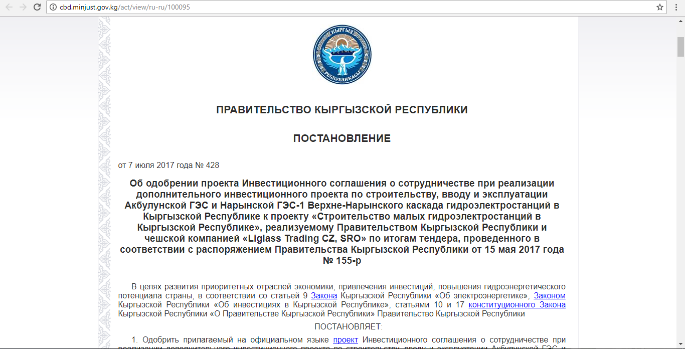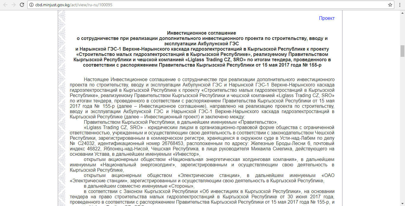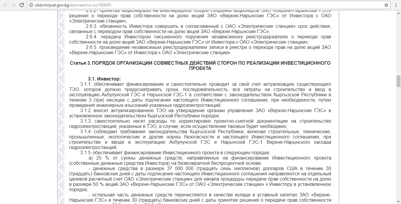 Однако недавно на сайте Министерства юстиции появилось постановление правительства о контракте с Liglass Trading. В нем есть и само инвестиционное соглашение. В этом документе указано, что 25 процентов от общей суммы контракта являются безвозмездным вкладом Liglass Trading в проект строительства Верхненарынского каскада ГЭС. При этом первые $37 миллионов из этой суммы перечисляются в течение 30 банковских дней после подписания соглашения. А оставшуюся часть чешская компания вносит после одобрения сделки по передаче 50 процентов акций ЗАО «Верхненарынские ГЭС» Liglass Trading.