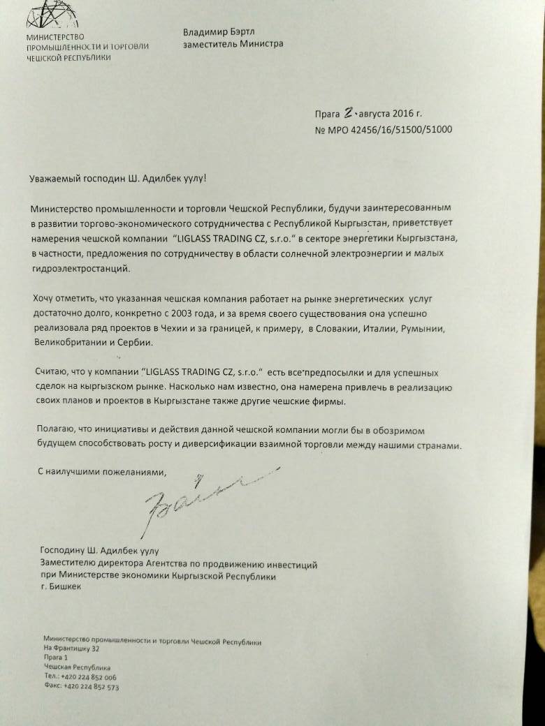 Также премьер-министру рассказали о письмах от официальных органов Чехии, на основании которых и принимались решения о допуске данной компании к тендеру. «Я честно сказал еще месяц назад, что есть официальное письмо из Министерства промышленности и торговли Чехии, которое официально поддерживало эту компанию и ручалось за нее. Это заверение на очень высоком уровне», — сказал Дуйшенбек Зилалиев.