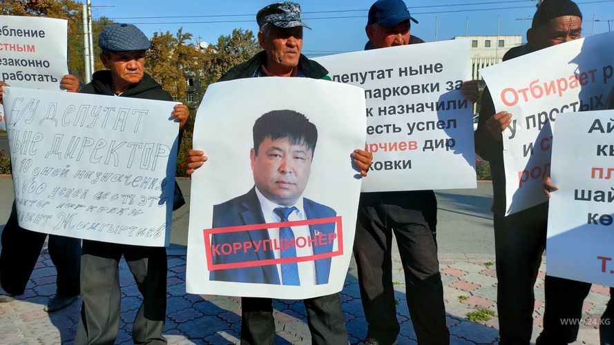 About 20 people demand resignation of the director of the municipal enterprise Talantbek Zhamgyrchiev. The protesters claim that he forced the parking attendants to work on weekends, and took away the proceeds.