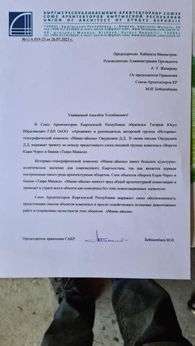 Earlier, members of the Union of Architects of the Kyrgyz Republic appealed to the Chairman of the Cabinet of Ministers Akylbek Japarov regarding the group of the complex Kyrk-Choro Gate and the tower Tavro of Manas. They expressed their concern about the upcoming demolition of the facilities of the complex and asked for assistance in stopping the dismantling and maintaining these Manas Aiyly facilities.