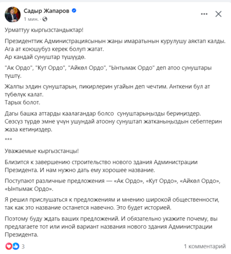 I decided to listen to the suggestions and opinions of the public, since this name will remain forever. This will be history. Therefore, I will wait for your suggestions. Indicate why you are proposing this or that option for the name of the new building of the presidential administration,» Sadyr Japarov wrote.