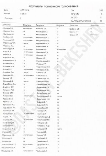 At least 66 deputies supported it, 5 voted against. These are Chingiz Aidarbekov, Dastan Bekeshev, Elvira Surabaldieva, Emil Toktoshev and Seidbek Atambaev. The bill has been sent to the president for signature.