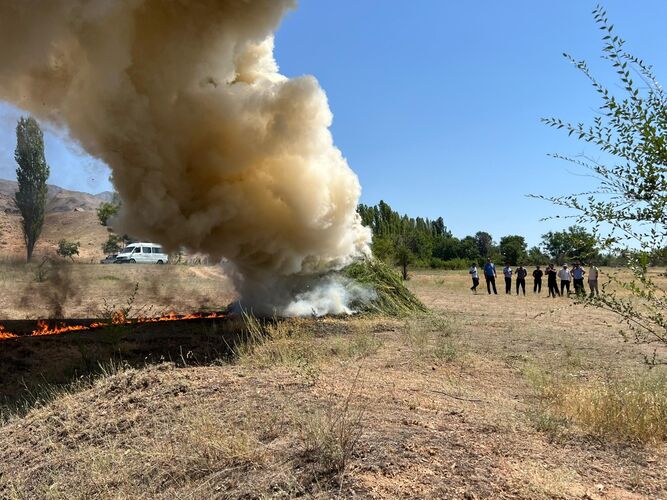 Law enforcement officers burned almost one ton of wild hemp in Bakai-Ata district. The press service of the Internal Affairs Department of Talas region informed 24-kg.com news agency.