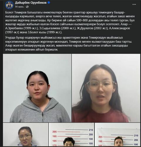 «He paid them money, forced them to conduct false investigations and worked with them on a special order. Each of them was paid from $500 to $800 monthly. These young people are former employees of the closed Kloop website. They are A. Erkebaeva (born in 1999), Z. Sydygalieva (born in 2000), Zh. Duulatov (born in 2002), A. Alexandrov (born in 1997) and Z. Bolot kyzy (born in 1999),» Daiyrbek Orunbekov wrote.