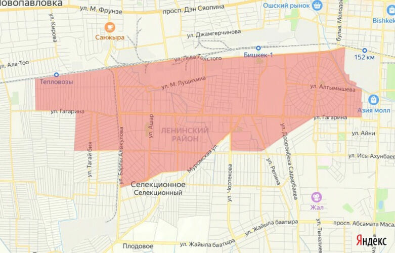 - Dzhunusaliev, Gagarin, Asanaliev, Boronbai, Zhaziyr, Chortekov, Aini, Muromskaya, Omur, Alykulov, Akhunbaev, Kursant, Torugart, Leo Tolstoy, Kalyk Akiyev Streets, 8th Line, Okhotsky and Volgogradsky Lanes up to Ala-Archa River, and Boltagulov Street.