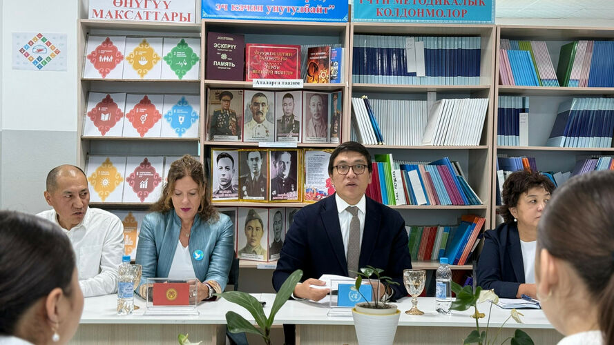 At secondary school No. 100 named after Baidyldy Sarnogoev in Bishkek, a class session was held with the participation of Deputy Chairman of the Cabinet of Ministers Edil Baisalov and the UN Resident Coordinator in Kyrgyzstan, Antje Grawe.