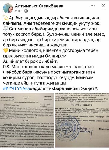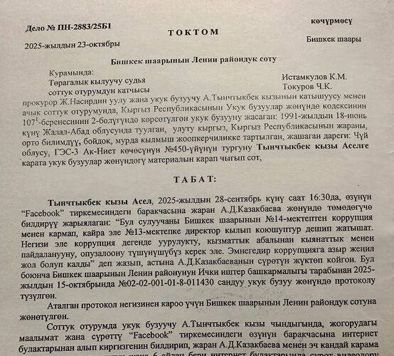 According to the document, the Leninsky District Court of Bishkek issued the ruling on October 23. It states that Asel Tynchtykbek kyzy, 34, published a post on September 23 in which she wrote that citizen A.D. Kazakbaeva, while working at school No. 14, was detained on corruption charges and was later appointed director of school No. 13.