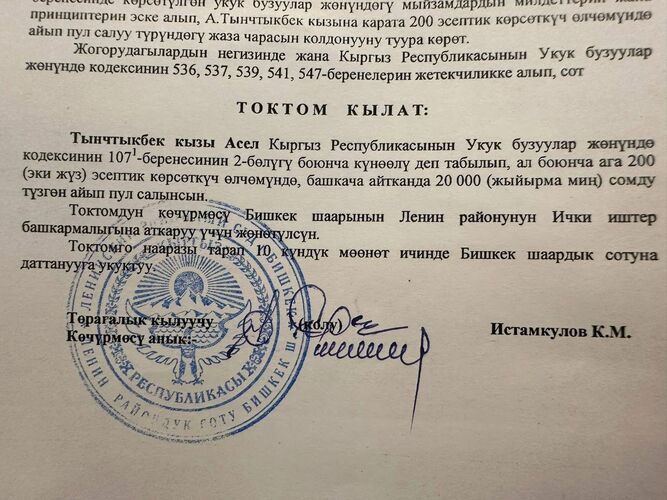 Asel Tynchtykbek kyzy was charged under Article 1071 of the Code of Offenses «Defamation and insult contained in the mass media, on an Internet website, or on an Internet website page.» The court fined her 20,000 soms.