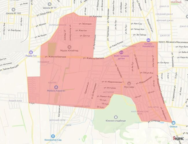 The outage area includes the southern part of Archa-Beshik and Selektsiya residential area, specifically the following streets: