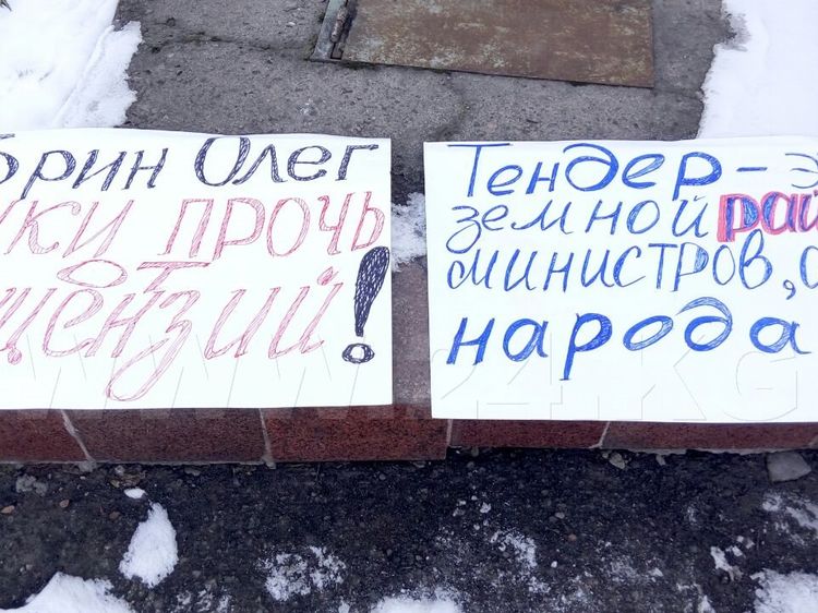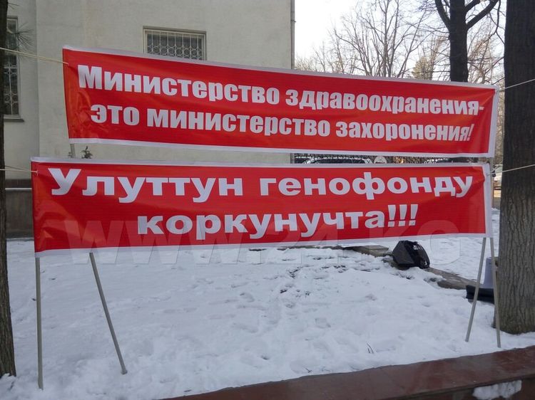 More than 20 protesters gathered in front of the building, they are holding posters with slogans «Dear President, whom have you entrusted health of the people?», «Kyrgyzstanis, how long can we tolerate arbitrariness of Farid Niyazov and Talantbek Batyraliev» and others.