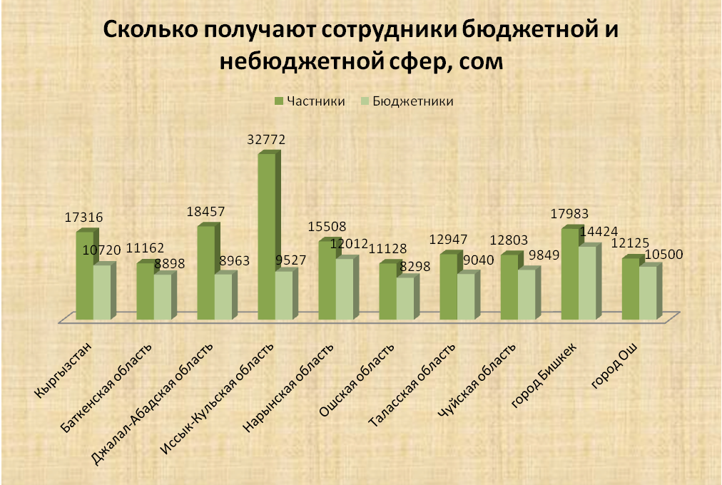 9. Больше всего работники бюджетной сферы получают в Бишкек - 14 тысяч 424 сома, а небюджетной - в Иссык-Кульской области - 32 тысячи 772 сома.