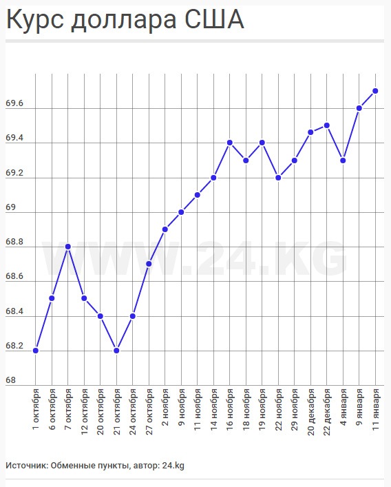 Сегодня обменные пункты столицы и коммерческие банки покупают доллар по 69,4 сома, а продают по 69,7 сома. Номинальный курс - 69,2854 сома (рост за сутки на 0,1 процента).