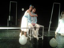 Постановку осуществил Валерий Крайнов. В ней задействованы актеры Владислав Алехин (Жених), Кристина Фойкина (Невеста), Никита Салимбаев (Душа жениха), Алена Быкова (Душа невесты), Сайрагуль Эсенбаева (Мать жениха, Судья). Как видим, действующих лиц немного, так же, как и декораций на сцене – стол, стулья, дверные рамы, большой кисейный занавес, который время от времени активно участвовал в действии… Что же происходило на сцене?